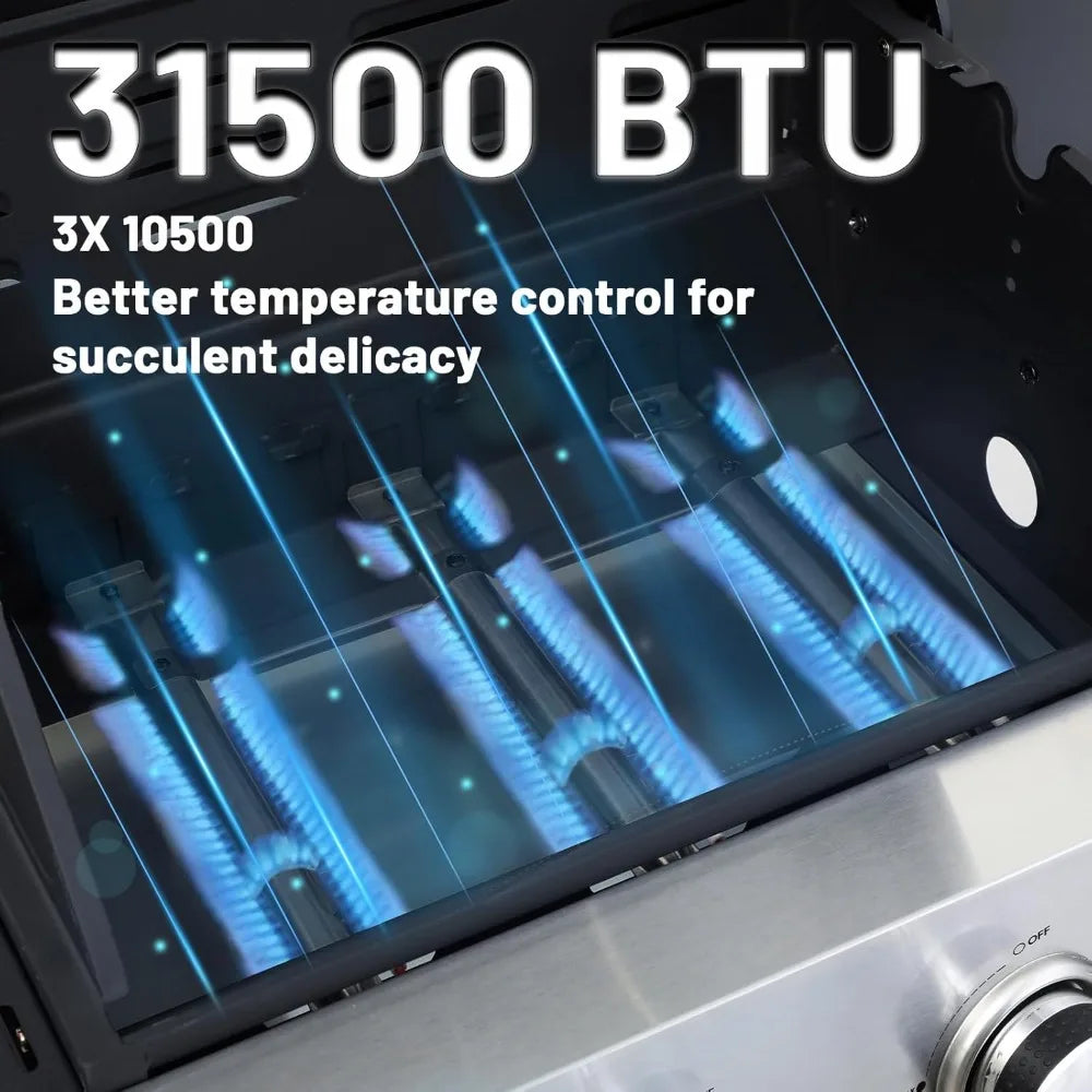 - You get three main burners (10,500 BTU each) plus a side burner (9,000 BTU) delivering a total of 40,500 BTU of cooking power, with rugged stainless steel for reliable performance.