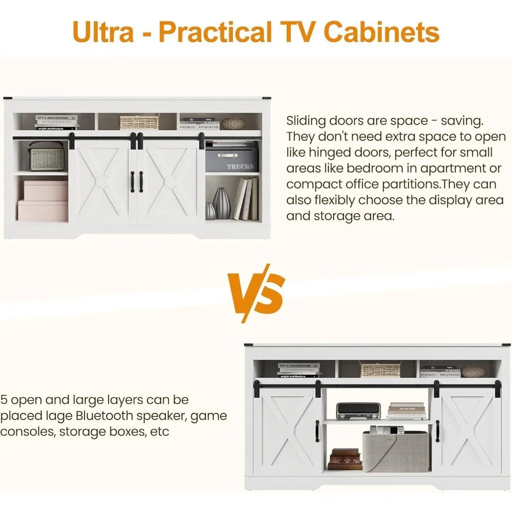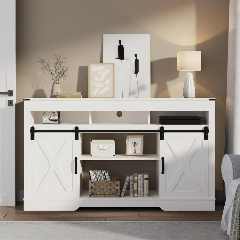 Elevate your living room with the Angduo Farmhouse TV Stand with Sliding Barn Door Storage, blending rustic charm with modern durability for your clutter-free space.